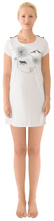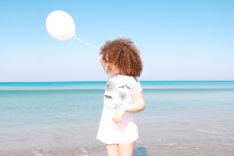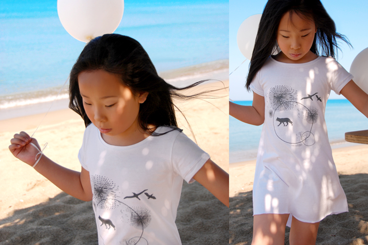 T-shirts and mini-dresses printed with a drawing of a fair tale. There is a wolf, the seagulls in a fantasy world.